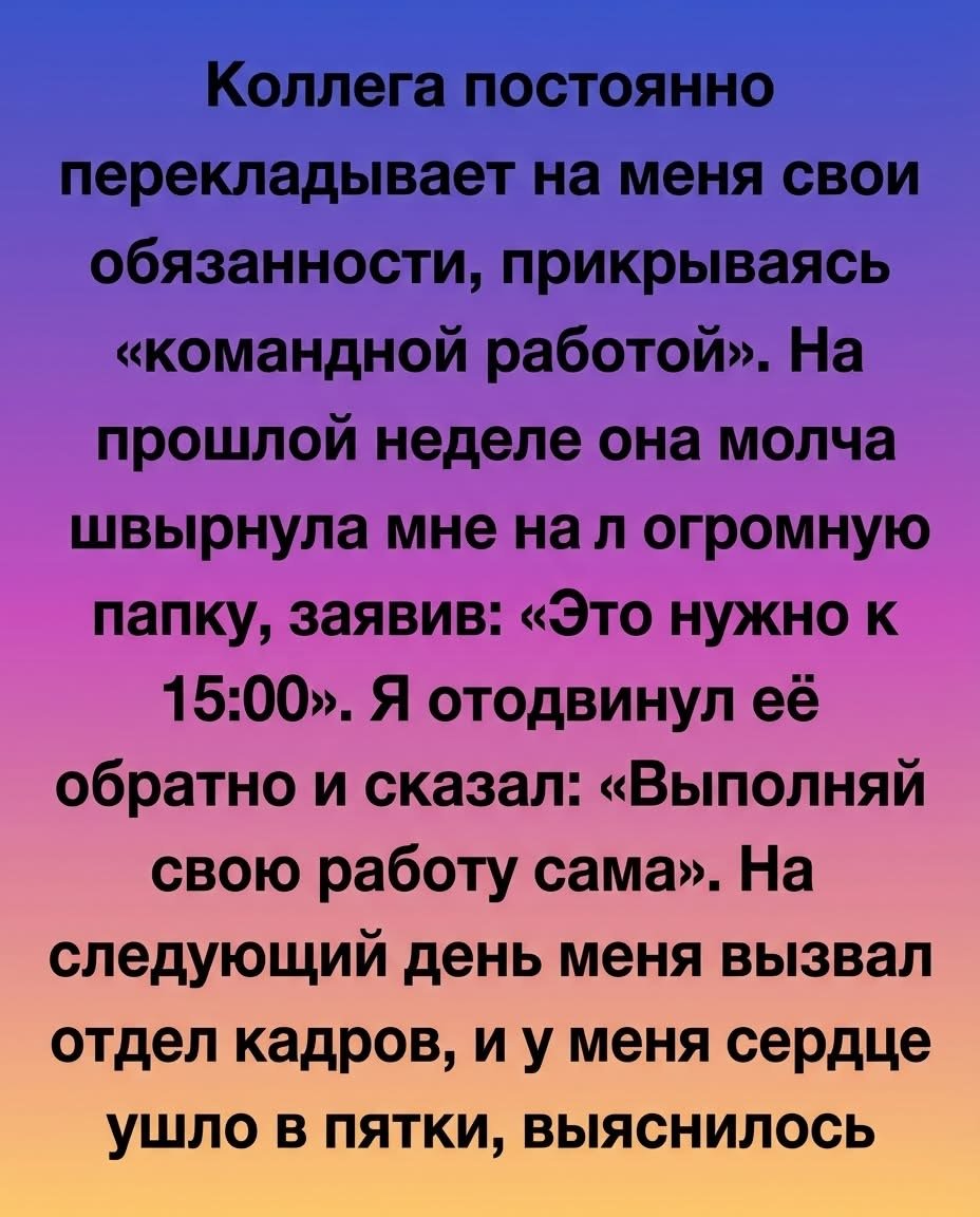 Я отказался выполнять работу коллеги и готовился к увольнению, но встреча в отделе кадров раскрыла такую тайну, что перевернула весь мой мир в офисе! Моя коллега постоянно сваливала на меня свои обязанности, называя это «командной работой». Её зовут Бьянка, и последние полгода она превратила мой стол в свой личный мусорный бак для задач. Мы работаем … Read more