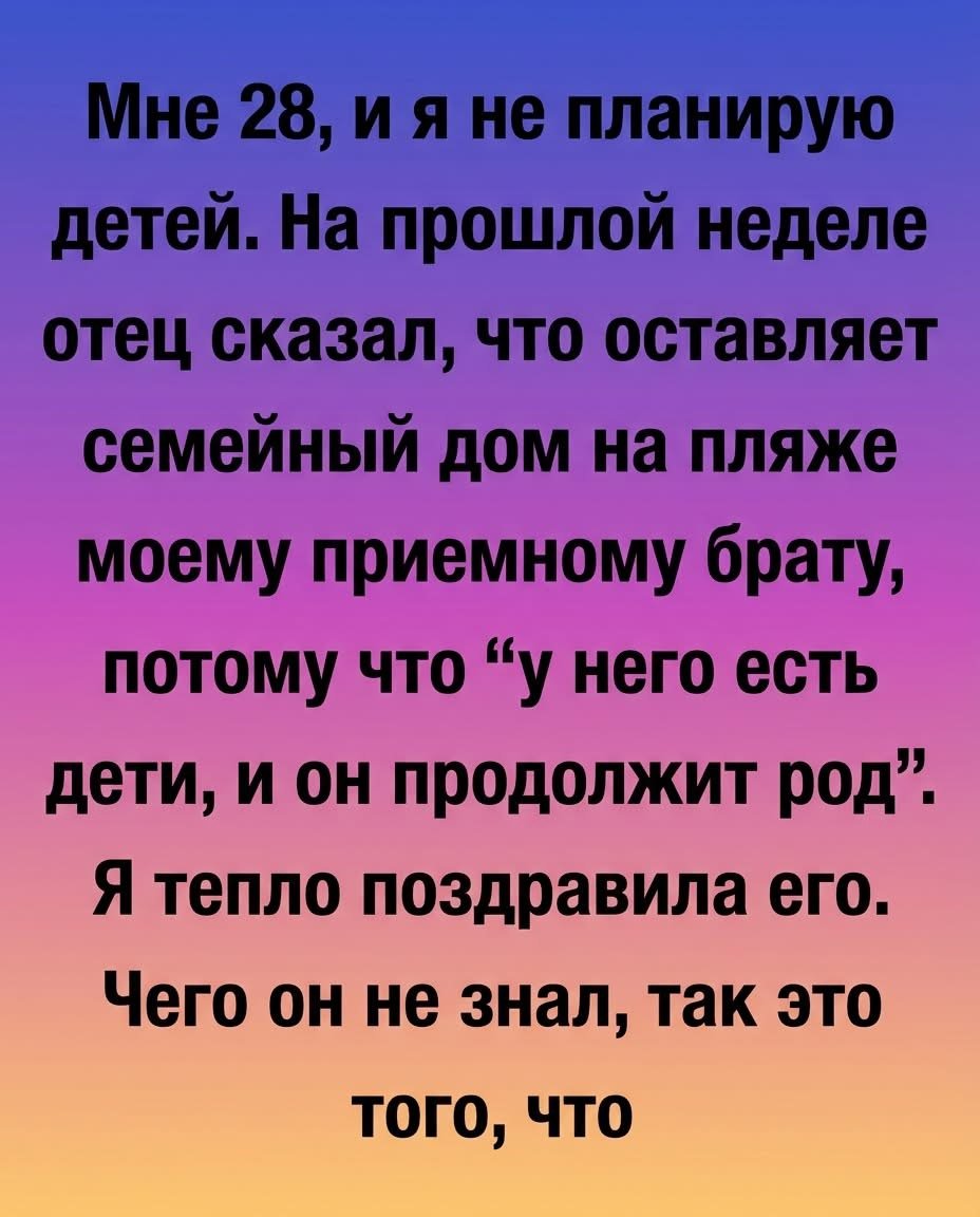 В свои двадцать восемь я не планировала детей. Поэтому, когда на прошлой неделе отец сообщил, что завещает наш фамильный дом на берегу моему приемному брату, Каллуму, сердце мое сжалось. «У него же дети, – аргументировал он, – он продолжит наш род». Я поздравила его, и ни единая мышца не дрогнула на моем лице, пока мы … Read more