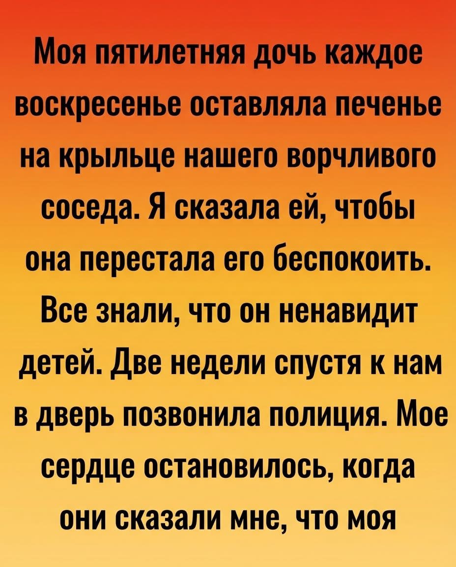 Маленькая девочка несла печенье угрюмому соседу каждую неделю – и не подозревала, что её доброта раскроет тайну, способную спасти жизнь! Каждое воскресенье моя пятилетняя дочь Дейзи оставляла свежее печенье на крыльце нашего угрюмого соседа. В её душе горел такой неугасимый лучик солнца, что, казалось, ни один самый мрачный человек не смог бы его погасить. И … Read more