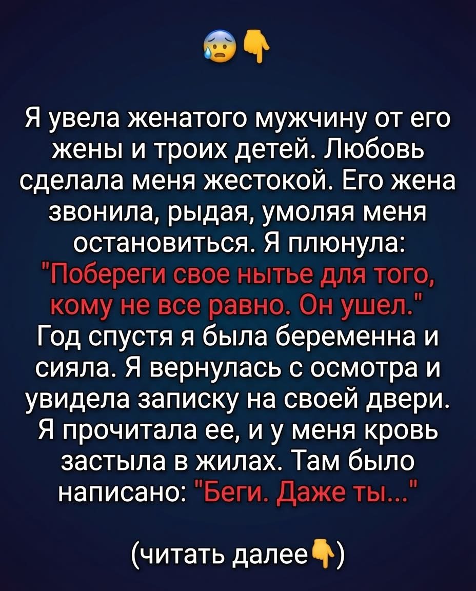 «Я думала, что ты забрала всю мою жизнь, когда украла моего мужа. Оказывается, ты просто вынесла мусор из моего дома. Тебе нужно знать, кто он. Не повтори моей судьбы. Возьми всё, что сможешь, и уходи. Он не изменится».
