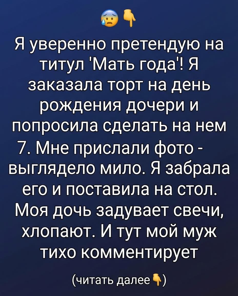 Я уверенно претендовала на звание «Матери года»! Я заказала торт на день рождения дочери и попросила украсить его цифрой 7. Мне прислали фото — выглядело красиво. Я забрала его и поставила на стол. Дочь задувает свечи, все хлопают. Затем мой муж тихо замечает: «Дорогая, это прекрасно, но почему пекарня поставила „7“ на торт нашей восьмилетней дочери?»